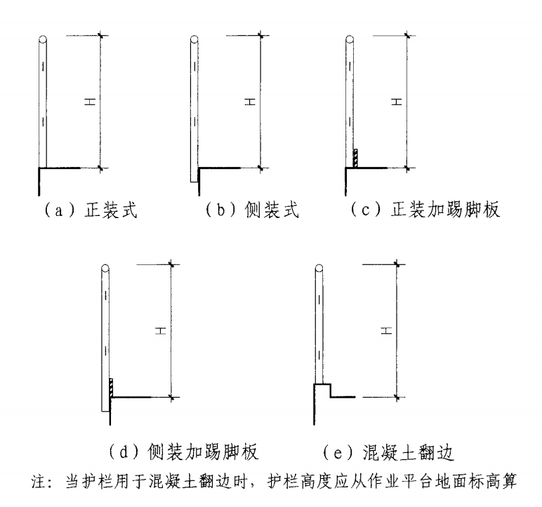 作業(yè)平臺(tái)鋼護(hù)欄立柱下端與主體結(jié)構(gòu)連接的安裝方式及代號(hào),分為五種,如下圖所示: